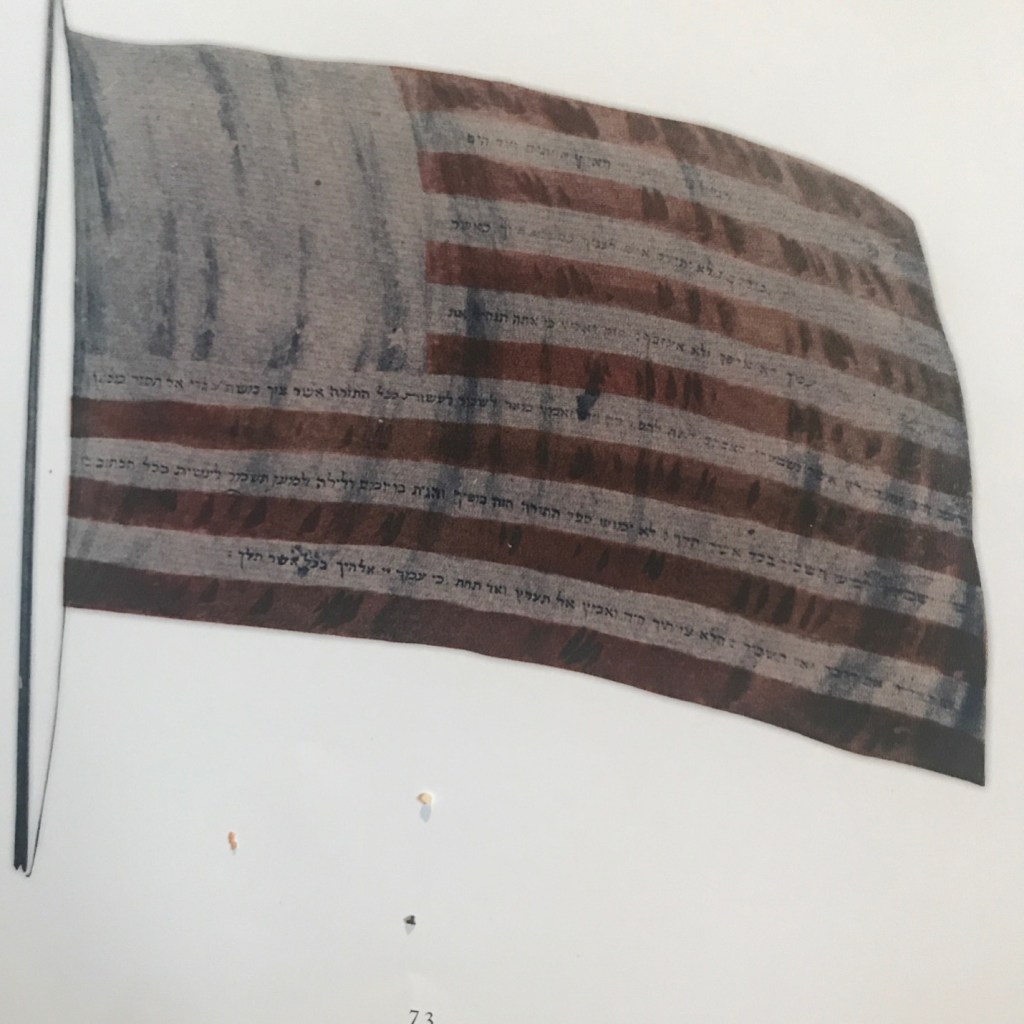 The above picture depicts the American flag which was presented to Abraham Lincoln a few weeks before his inauguration by Abraham Kohn. It was embroidered with original Hebrew verses. See footnote for more of its background.[1]